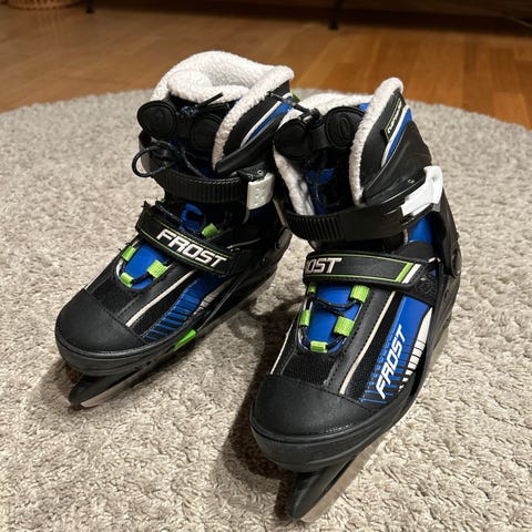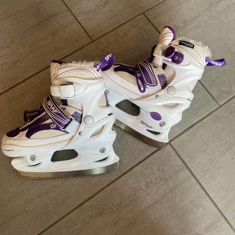 Justerbare skøyter selges. Pent brukt, men har noen sprekker på tuppen på den ene skøyta.