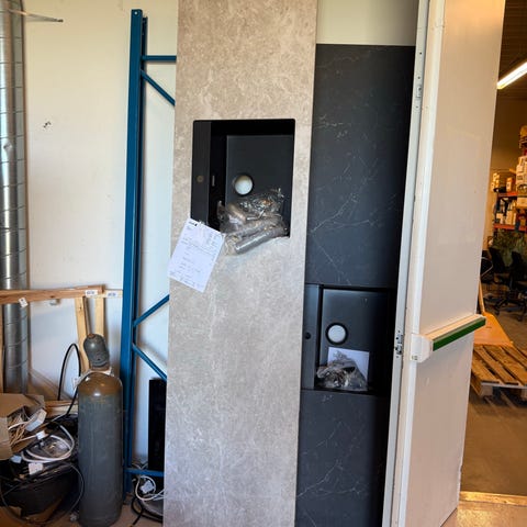 • 1 stk hjørneskap, 86,5 x 86,5 cm, med hyller. Dør 31,5x31,5cm (800kr)