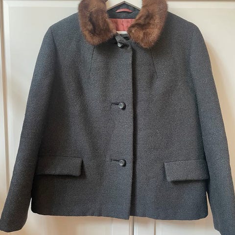 Sjelden og vakker kåpe fra 50/60 tallet. Elegant snitt, produsert av merket Drabstad. Har hengt oppbevart og ubrukt i flere tiår. Fargen er koksgrå/grå litt avhengig av lys. Kan fungere som kjole også pga det elegante snittet. Ganske sikker på at stoffet er i tynnvevd ull, men det står ingen lapp på den utover merket Drabstad.
