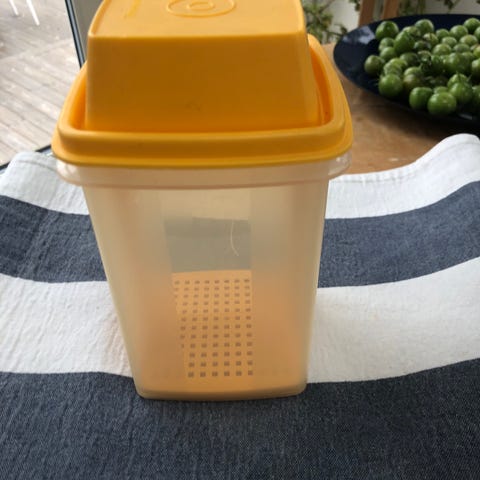 Tupperware retro, i plast med gult lokk og gjennomsiktig kropp. Denne kan en ha f.eks. sur-agurk, rødbeter eller oliven i.