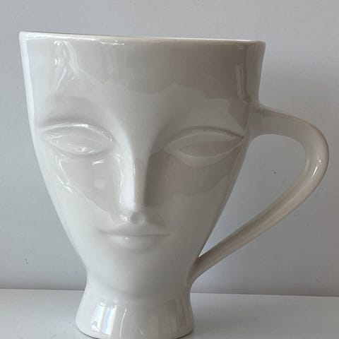 Hvert ansikt avslører en matt porselensprofil fra den ene vinkelen, og en skarp silhuett fra den andre i vekslende svart og hvitt.