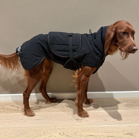 Min hund er 70 cm i rygg, 75 rundt brystet og veier 35 kilo. Blandingshund, gordon setter, alaska husky, stor brystkasse.