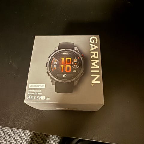 Selger en ny Garmin Fenix 8 Pro 47mm. Det er sapphire, titan med grafittfarget/svart rem.