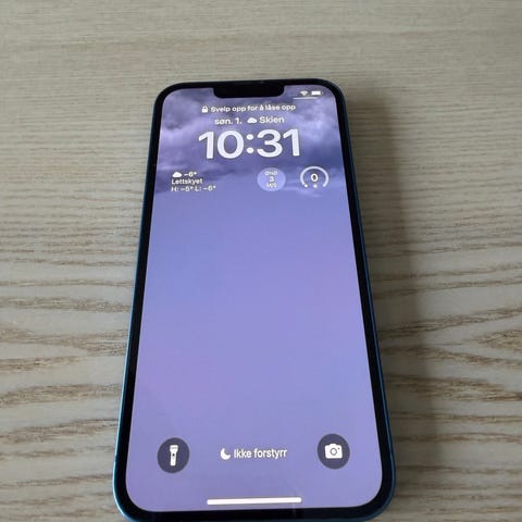 Pris kan diskuteres Apple iPhone 13 mobiltelefon med 256 GB lagringskapasitet i svart farge. Enheten har synlige bruksmerker og riper på baksiden. Telefonen er i funksjonell stand med operativsystemet på skjermen.