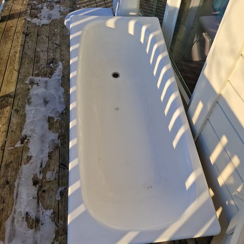 Gratis, kom og hent. Dusjkabinett med sprekk i ene døra, badekar,grov vask, baderomsinnredning med servant,blandebatteri og overskap.
