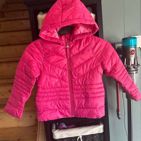 Uniqlo barnejakke i størrelse 120 men liten i str, designet for jenter. Jakken er blå og laget av polyester. Den har hette og glidelås foran.