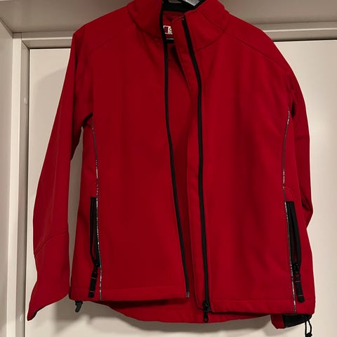 Dyprød og svart workwear skalljakke for dame. Stl. M. Som ny. 3 lommer med glidlås. Strammesnor i hette og nede på jakken som gir bedre passform og beskytter mot vind og vær.