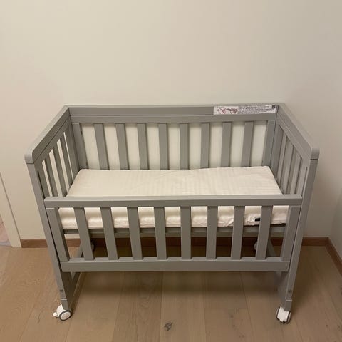 Kjekk og fin bedside crib, men kan også brukes som babyseng stående for seg selv. Brukt av to barn, frem til ca 5 mnd.