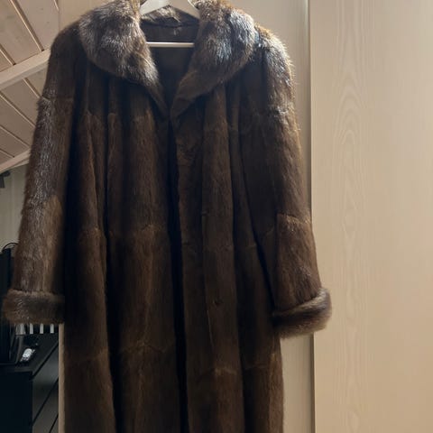 Pelsen har en klassisk og tidløs fasong med flott fall, myk og tett pels og en dyp mørk brun farge. Den er svært lite brukt og fremstår i meget god stand – blank og jevn pels uten slitasje. Elegant sjalkrage og hel lengde gir et eksklusivt uttrykk.
