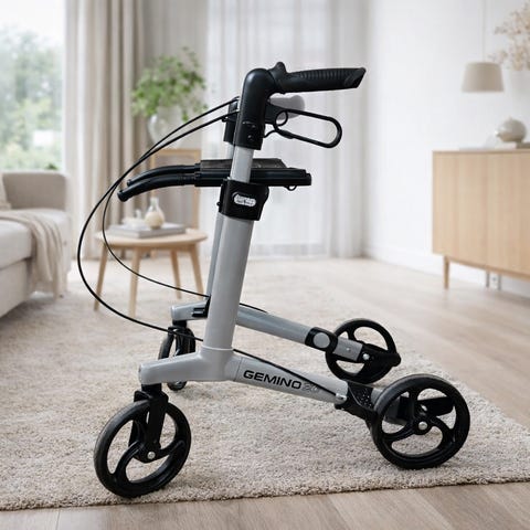 Rullator med fire hjul, håndtak med bremser og integrert sete. Rullatoren har en kurv under setet for oppbevaring. Egnet for personer som trenger støtte ved gange og mulighet til å sette seg ned ved behov.