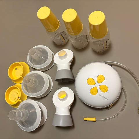 Medela Swing Maxi elektrisk brystpumpe med diverse tilbehør inkludert flasker, pumpeflasker og tilkoblingsdeler.