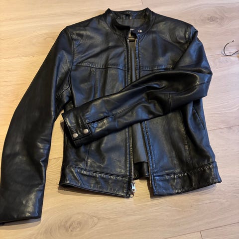 & Other Stories Andre jakker skinnjakke i størrelse M for dame. Jakken er svart og laget av skinn. Den har glidelåser foran og detaljer som gir et strukturert utseende på ermene og rundt midjen. Passer for S.