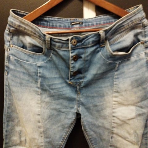 Kule bukser i merket Suite benedict kjøpt i Amsterdam. Vide og korte bein hvor buksebeina når til litt over anklene. Høy i livet. Fin passform. Står ikke størrelse i men tipper den er en str 40 eller M/L midjemål 30. Lite bruksmerke i front med knapp og glidelås, se siste bildet. Selger dermed billig.