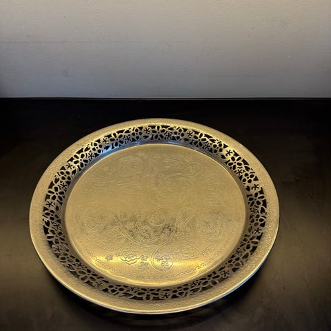 Selger et dekorativt sølvfarget metallfat fra Lisbeth Dahl. Ca 50 cm i diameter.