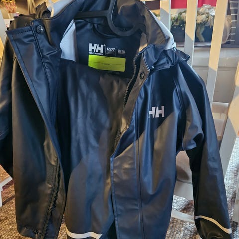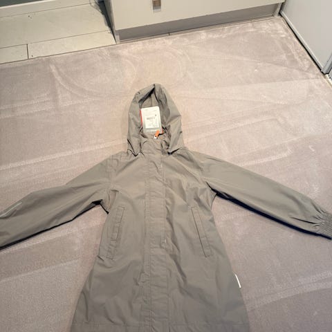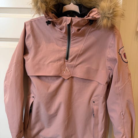 Godt brukt anorakk med noen mørke flekker. Mye bruk igjen. Str 8 år. Følger også med pels til hetten.