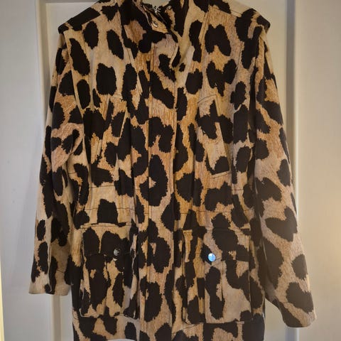 Selger en stilig leopardmønstret jakke i denimkvalitet fra GANNI i størrelse 34. Jakken er pent brukt og i veldig god stand. Klassisk skjortejakke-fasong med knapper i front og brystlommer. Perfekt som overgangsjakke eller som statement-plagg inne.