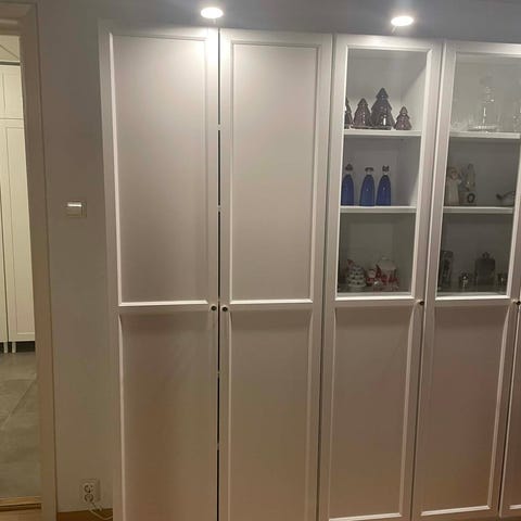 Pent brukt elvarli seksjon. Bygg på den du allerede har eller legg til elementer fra IKEA. I fin stand, men har en malingsflekk på det som har vært brukt som hattehylle. Svært fleksibelt med takhøyde opp til 350cm. Juster enkelt med skinnene!