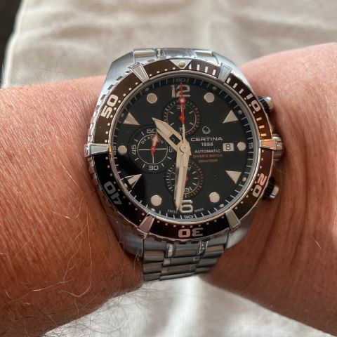 Certina Sea Turtle herreklokke med rund urskive og svart reim. Klokken har en tydelig markør for dato og er designet med en blågrønn urskive. Bakdekselet viser Sea Turtle Conservancy-logo, noe som indikerer et samarbeid eller støtte til bevaringsarbeid. Klokken leveres med original eske og tilbehør.