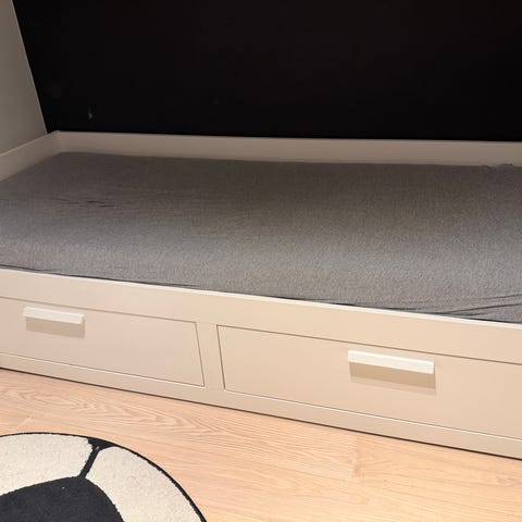 IKEA seng med skuffer i hvit farge. Sengen har integrerte oppbevaringsskuffer under madrassen, noe som gir ekstra lagringsplass. Passer til bruk som enkeltseng i rom med begrenset plass.