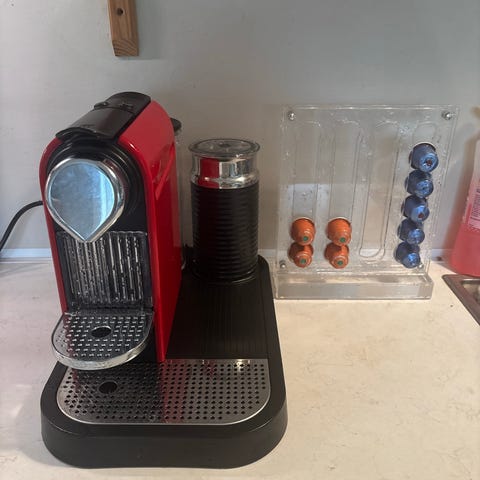 Selger en Nespresso CitiZ kapselmaskin med Aeroccino melkeskummer. Brukt maskin med synlig slitasje over lukkemekanismen.
