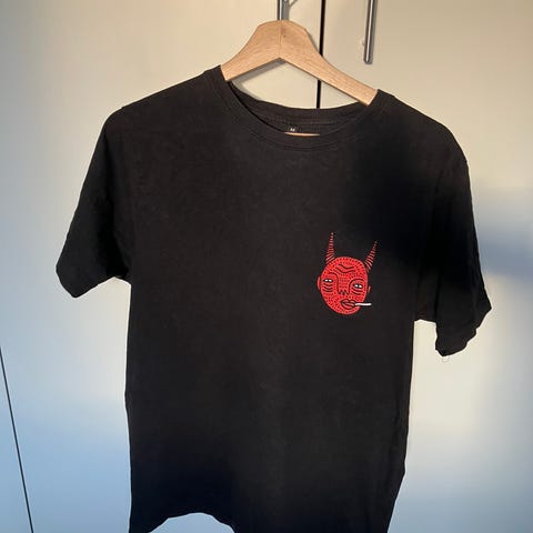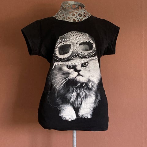 Søkeord: grafisk trykk og brodert katt, t-skjorte