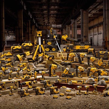 Verktøypakke på 18 V som inneholder DCD996 slagborhammer, DCF894 muttertrekker, DCG405 vinkelsliper (125 mm), DCH273 borhammer, DCS367 tigersag, DCS570 sirkelsag, DCS335 stikksag, DCL050 LED-lampe, fire 18 V 5,0 Ah-batterier, hurtiglader, vogn og tre Toughsystem-kofferter.