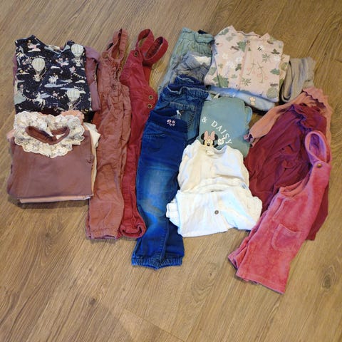 Klespakke til jente i str 86 selges. Synlig brukte klær, men ingen hull, så mye bruk igjen. Flekker kan forekomme. Pakken inneholder: