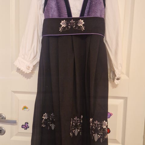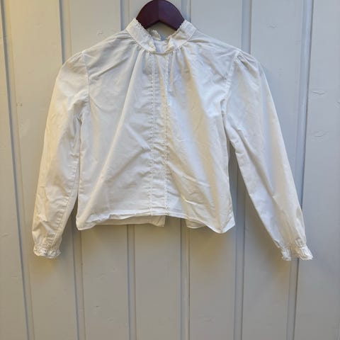 Bunadskjorte i hvit bomull for jenter i størrelse 140. Blusen har lange ermer, knappelukking foran og dekorative knapper ved kragen. Laget av bomullsmateriale. Merke: Små-troll.