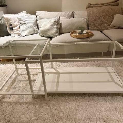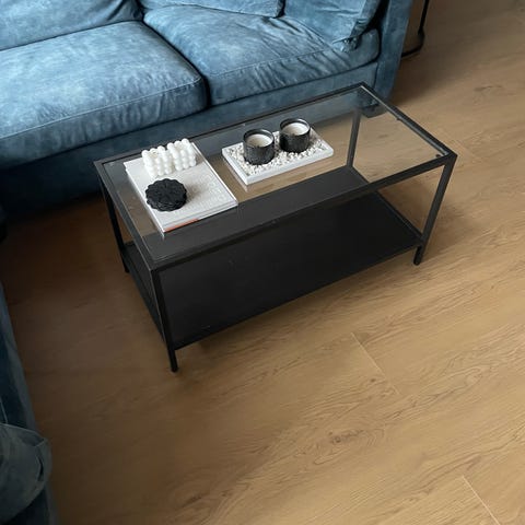 Pent brukt stuebord som kan trekkes opp på ene siden slik at man kan spise eller benytte lagringsplassen inni bordet.
