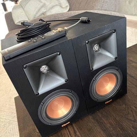 Kef aktive høyttalere, kan kobles opp med 3,5 mm jackplug eller phonokabler. Disse har ikke bluetooth eller wifi. Selges da de ikke blir brukt, alt originalt tilbehør medfølger, inklusive innpakning. Kan leveres Voss-Haugesund-Oslo.