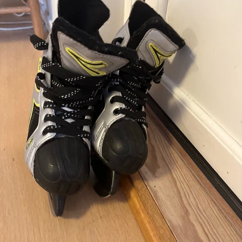 Bauer ishockeyskøyter for barn i størrelse 27. Skøytene er designet for ishockey og har hvite lisser med svart og gult design. Hentes på Sola