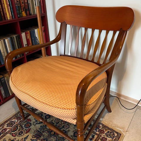 Selger en salongstol i stoff, grønn farge. Pent møbel, vel utført håndarbeid. Høyde er fra gulv til sete. Høyde hel stol er ca 90 cm. Avtagbart trekk.