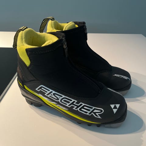 Fischer XJ Sprint langrennssko i størrelse 32. Skoene har en svart og gul fargekombinasjon og glidelås foran for enkel påkledning. Skoene er designet for barn og har en innvendig fôr i gul farge.