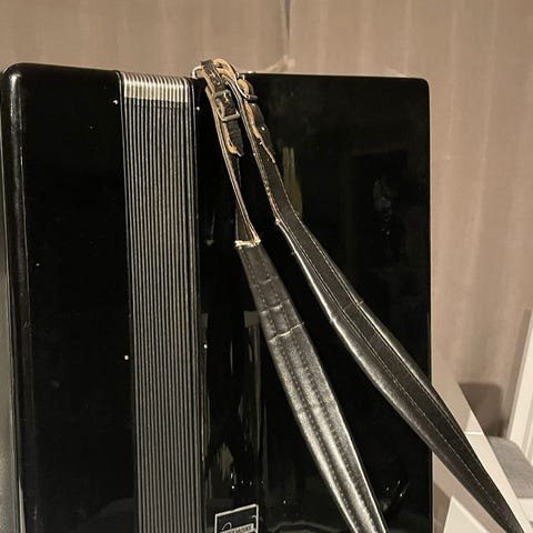Scandalli L 201/A trekkspill med svart og beige farge. Instrumentet har knapper og er produsert i Italia.