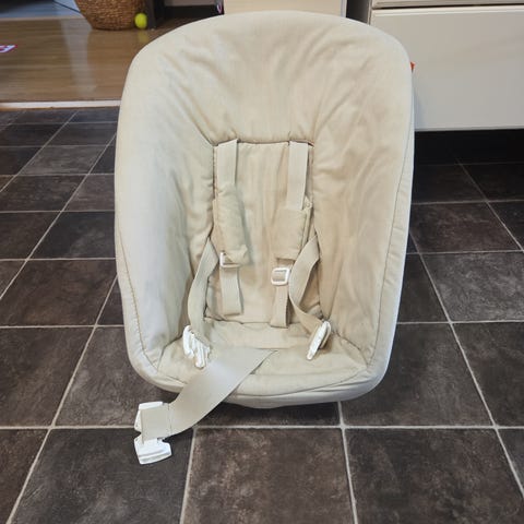 Stokke barnestol med grå trekk. Designet for barn med sikkerhetssele og justerbar sitteposisjon. Laget i solid materiale for stabilitet og komfort.