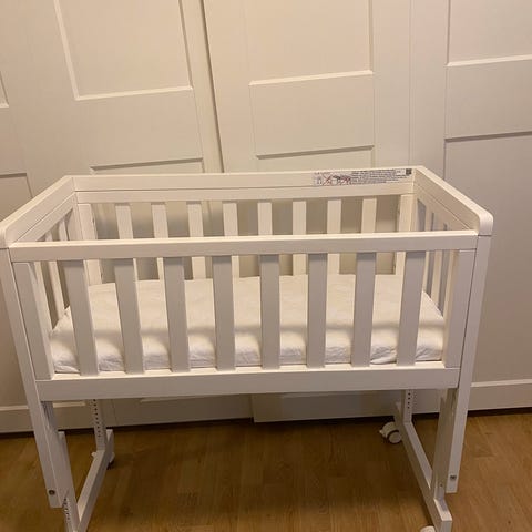Selger en pent brukt bedside crib fra TROLL. Hjulene kan låses, og ene siden kan enkelt tas opp og ned. Helt ny madrass kjøpt høst 2025, men den er nesten ikke brukt da nyeste familiemedlem helst ikke ville ligge for seg selv.