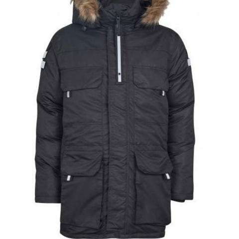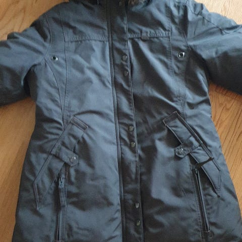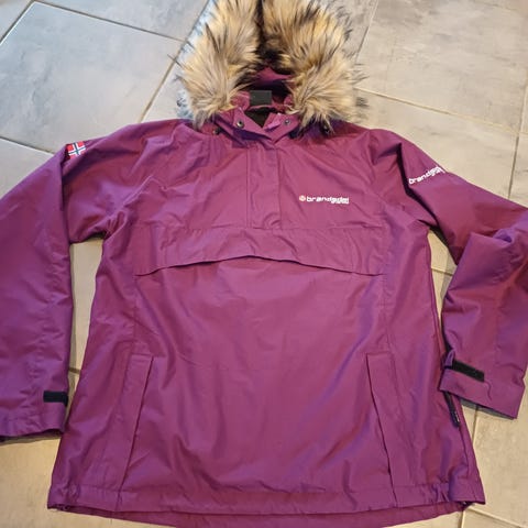 Jean Paul Annet yttertøy for dame i størrelse L. Jakken er blå og laget av dun. Den har hette med pelskant og glidelås i front. Passer til utendørs bruk.