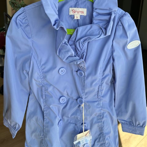 Barne jakke/kåpe i størrelse 128 for jente, i rødt. Jakken har en pelsaktig krage og doble knapper foran. Ermer har en vid utforming som gir en spesiell stil. Passer for kaldere vær.
