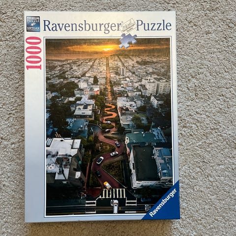 Ravensburger Puzzle med 1000 brikker. Puslespill med ulike motiver, inkludert bylandskap, natur, havn og stilleben. Laget for voksne og eldre barn som liker puslespill som hobby.
