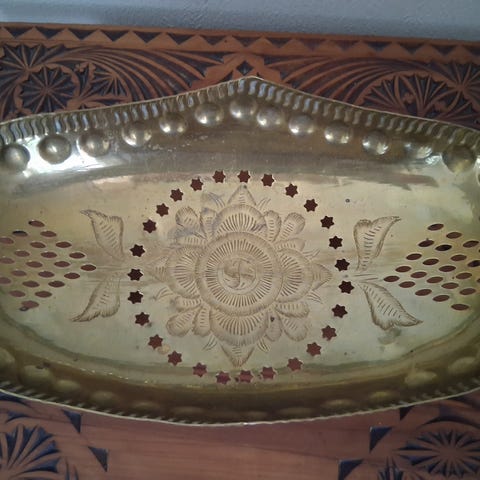 Gedigent flott messing fat, pynter opp på ett spisebord