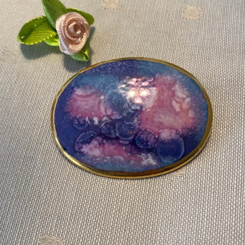 Nydelig vintage brosje i håndmalt porselen, signert.Dekorert med pene blomster i delikate toner og gull. Unik og dekorativ.