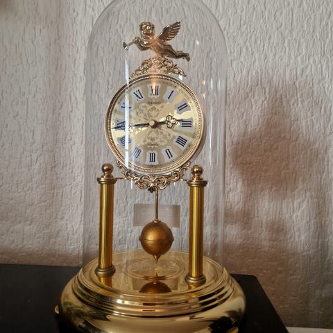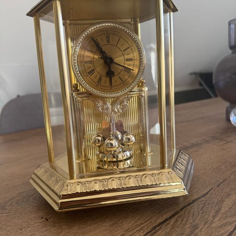 Selger en gammel fin gullfarget bordklokke som går riktig. Høyde 28 cm.