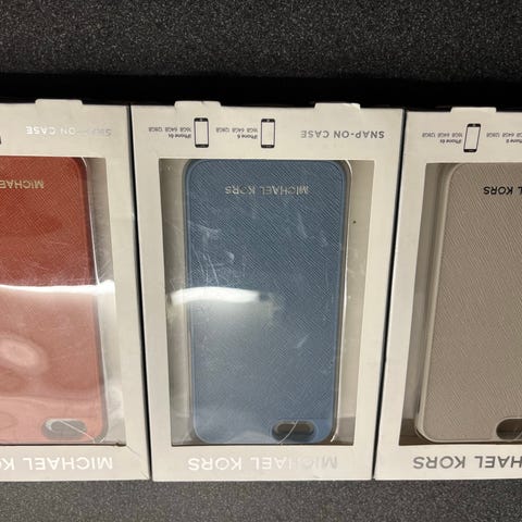 Apple telefondeksler i forskjellige farger. Dekslene har en rund magnetisk markering på baksiden, sannsynligvis for kompatibilitet med trådløs lading eller MagSafe-tilbehør. Materiale og størrelse er ikke spesifisert. Selges til 20 kr pr stk