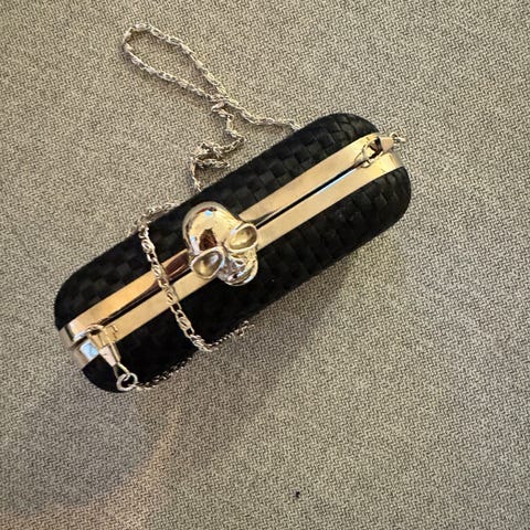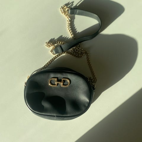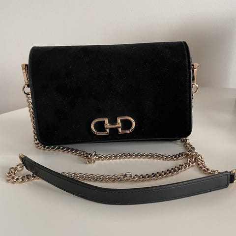 sort veske med gulldetaljer.