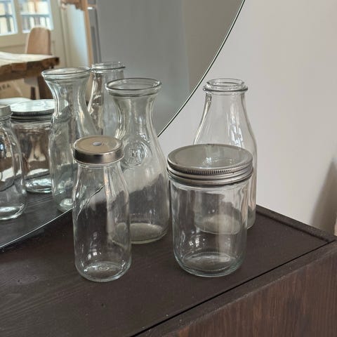 2 glassflasker til oppbevaring av mat/drikke eller hobbyutstyr som f.eks perler.