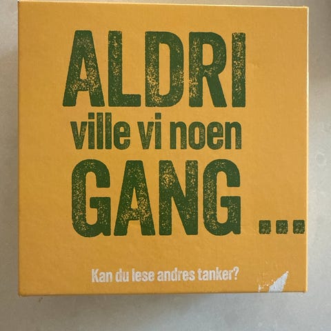 Jeg Har Aldri Original brettspill. Inkluderer 220 spørsmål og 30 utfordringer. Spillet er ment for 2-10 spillere og anbefales for personer over 18 år. Spillet leveres i en boks med svart og gul design.