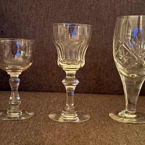 SELGER 2 ANTIKKE OG PRAKTFULLE GLASS MED NYDELIG HÅNDMALT " MARY GREGORY " DEKOR.