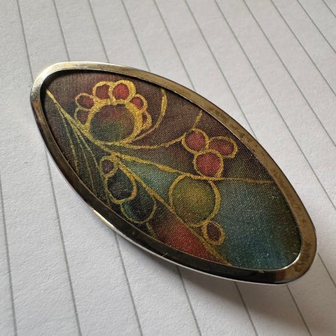 Håndmalt silkenål. Festet på en diskret bunn av plast. Måler 5.5 cm på det bredeste. Fin bredde og detilat farge.