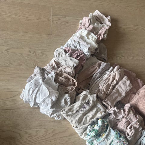 Klespakke med mange fine plagg. Alt er i en fin tilstand on har ikke synlige bruksmerker. Jakken er litt skitten men ellers så ser alt veldig bra ut. Pysjen er laget mest sannsynlig av polyester og er veldig varm og god