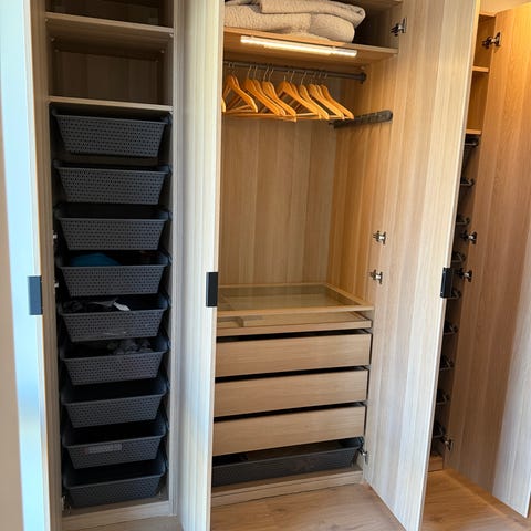 Høyre del av skapet består av seks rom, mens venstre del består av to klesstenger til oppheng av skjorter, kjoler og lignende, samt to hyller.